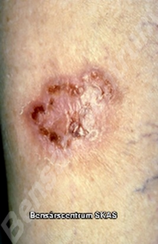 Basalcellscancer är vanligast (basaliom). Sår på grund av melanom eller skivepitelcancer är mindre vanliga.